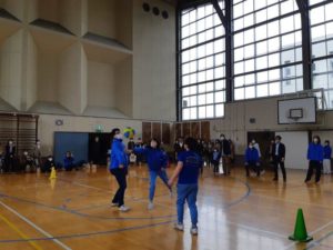 走って コーンを回って戻って来、次の走者にバトンタッチです。